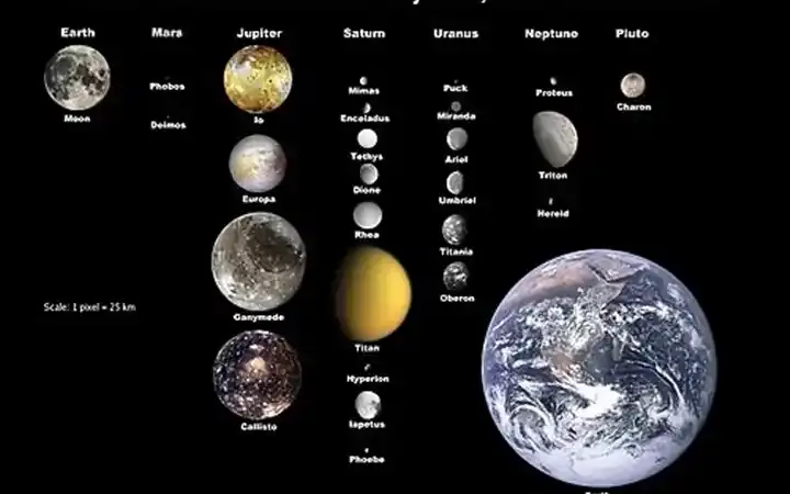 مقارنة أحجام الأقمار الرئيسية في النظام الشمسي بحجم الأرض. تسعة عشر قمراً كبيراً بما يكفي ليكون مستديراً، والعديد منها يحتوي على محيطات تحت سطحه، وواحد، تيتان، يتمتع بغلاف جوي كبير